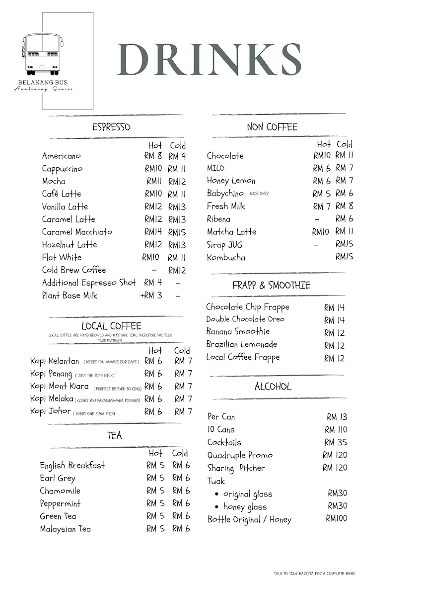 The menu at Belakang Bus Cafe x PitboyBBQ offers a selection of food and beverages suitable for various times of the day, including breakfast, light meals, and coffee breaks. Visitors can find a variety of coffee options alongside local beverages, reflecting typical cafe-style drink offerings.