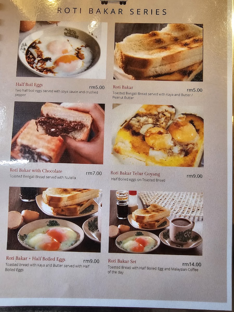 Food items include breakfast choices such as nasi lemak, as well as light meals and snacks like fish and chips and kaya toast. The menu supports casual dining with a focus on straightforward, local and cafe-style fare. The beverages primarily include different styles of coffee and hot drinks, catering to coffee enthusiasts and those seeking simple refreshments.